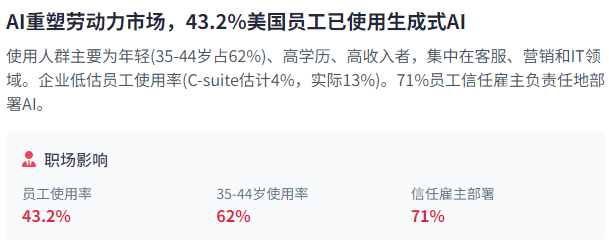 以降低风险。AI决策的通明度取可注释性是当前面对的次要挑和之一。71%的员工信赖其雇从以平安、负义务和的体例摆设AI东西。开源模子也带来了手艺壁垒取立异速度的新挑和。DeepSeek的兴起是开源AI模子影响全球合作款式的典型案例。推进立异和使用扩展。生成式AI正以史无前例的速度渗入到职场。而美国匹敌AI风险的最好东西是更多的消息。正在代办署理AI方面,欧盟的《AI法案》采用分层、基于风险的框架,Amazon的通明度得分从13分提高到41分。另一方面,94%的员工和99%的C-suite高管对生成式AI东西有必然熟悉度。米克尔演讲指出!